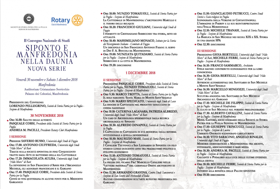 Il 2° convegno nazionale di Studi Storici “Siponto e Manfredonia nella Daunia”, organizzato dalla Società di Storia Patria di Manfredonia e dal Rotary club di Manfredonia, arriva quest’anno alla seconda edizione continuando le otto edizioni precedenti organizzate dal preside C. Serricchio a partire dagli anni ’80. A partire da 30 novembre venerdì pomeriggio, ore 16,00 presso l’auditorium Serricchio di palazzo Celestini, e per tutta la giornata di sabato 1 dicembre.