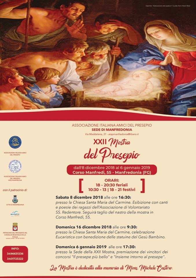 “XXII Mostra del Presepio” organizzata dall’ Associazione Italiana Amici del Presepio – Sede di Manfredonia. Dall’ 8 dicembre 2018 al 6 gennaio 2019 presso Corso Manfredi 55 a Manfredonia.