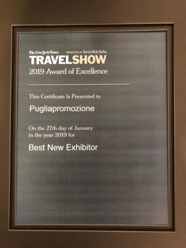Finale a sorpresa per la Puglia a New York: il Travel Show premia Pugliapromozione con il 2019 Award of Excellence, nella categoria “Best New Exhibitor”, tra centinaia di espositori internazionali!