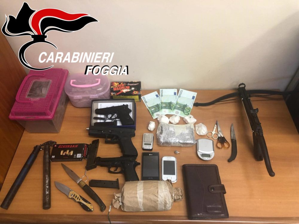 Nella mattina di ieri i Carabinieri del Nucleo Operativo e Radiomobile della Compagnia di Manfredonia, coadiuvati dai militari della Stazione di Monte Sant’Angelo e da unità del Nucleo Carabinieri Cinofili di Modugno, hanno tratto in arresto, nella flagranza dei reati di detenzione a fini di spaccio di sostanze stupefacenti e di illecita detenzione di armi clandestine e di esplosivi, un giovane manfredoniano, denunciato anche per la detenzione abusiva di munizioni e armi bianche non denunciate.