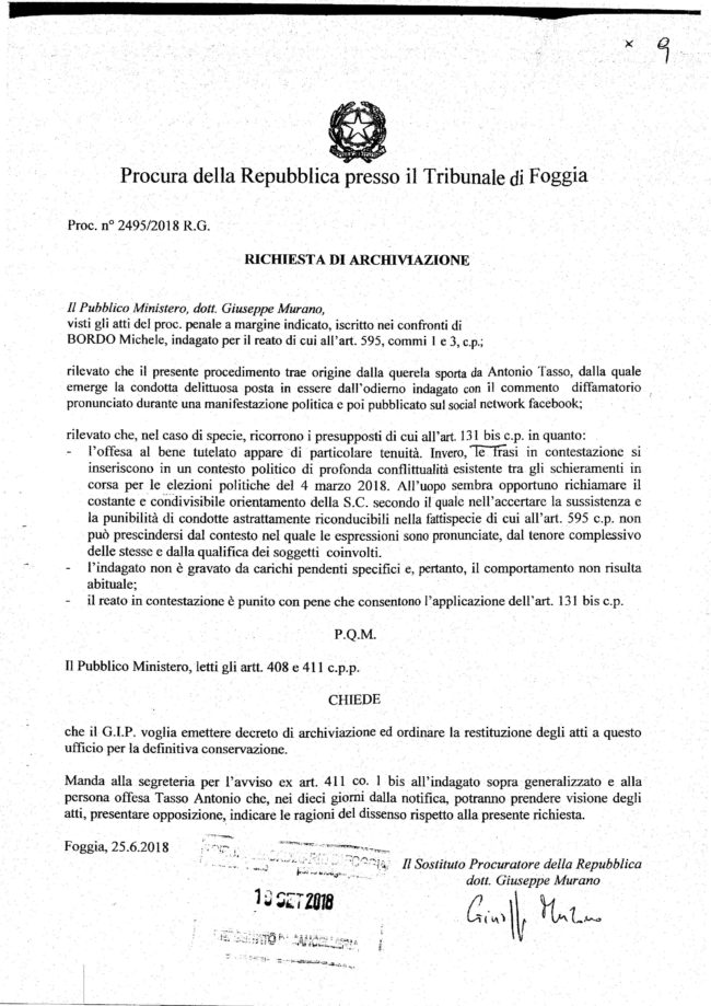 Quindi, non capisco cosa abbia da festeggiare il collega Michele Bordo, dal momento che la Archiviazione, così come richiesta dal pubblico ministero “ex art. 131 bis”, comporta un fatto oggettivo: “IL REATO DI DIFFAMAZIONE E’ STATO COMMESSO”, solo che – ritenendolo di non di grave entità – ne è stata disposta l’archiviazione, con tutte le procedure e le conseguenze del caso, compresa la possibilità di continuare l’azione ad altri livelli.