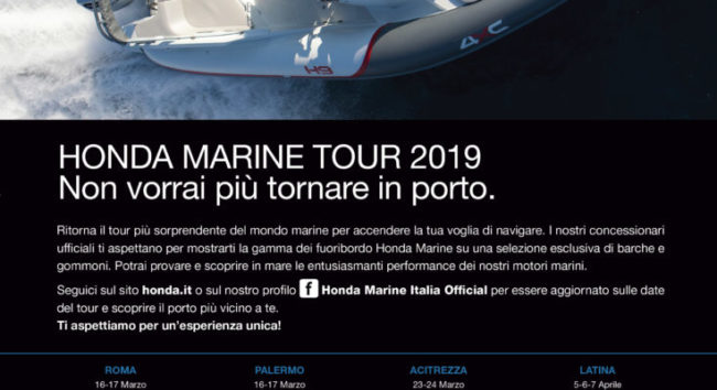 Dopo il successo ottenuto lo scorso anno con la prima edizione dell’evento “Porti Aperti”, Honda Marine è lieta di dare il via alla seconda edizione dell’Honda Marine Tour 2019 che avrà inizio nel fine settimana del 16 e 17 marzo con il doppio appuntamento di Roma e Palermo.