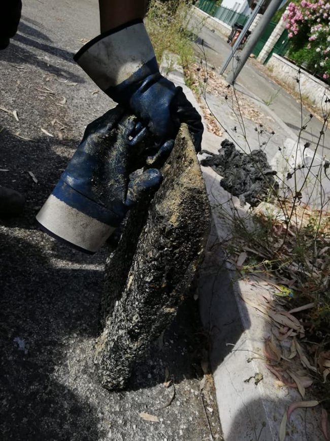 Era purtroppo un grosso masso, probabilmente è dolosamete introdotto nella fogna ad ostruire l’impianto fognario di Siponto, per cui lo sversamento di liquami in strada e nel torrente.