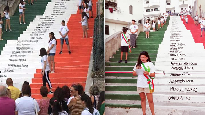 Taglio del nastro e inaugurazione ieri sera, 4 luglio 2019, per la scalinata della legalità in via Verdi a Vieste. Tantissimi ragazzi hanno affollato