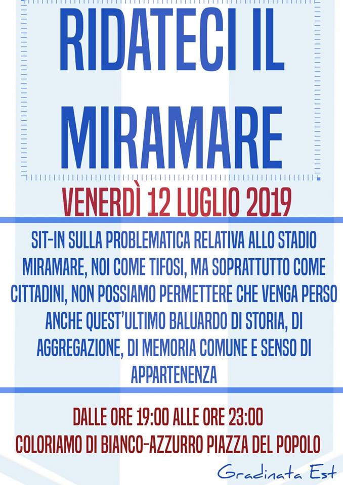 “Ridateci il Miramare”. Si terrà venerdì 12 luglio la manifestazione sulla problematica stadio per non permettere che venga perso anche quest’ultimo baluardo di storia, di aggregazione, di memoria comune e senso di appartenenza. E sulle polemiche relative a “problematiche più serie”: “Siamo stati i primi ad esporci sull’Ospedale e contro Energas, mentre voi eravate online”.