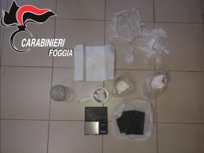 Arresto in flagranza dei Carabinieri, a Manfredonia, per detenzione ai fini di spaccio di sostanze stupefacenti di Falcone Michele, 50enne inoccupato del posto, con precedenti di polizia, sorpreso in possesso di quasi sei grammi di cocaina, oltre a tutto il materiale da taglio e confezionamento. Al termine delle formalità di rito Falcone è stato posto agli arresti domiciliari.