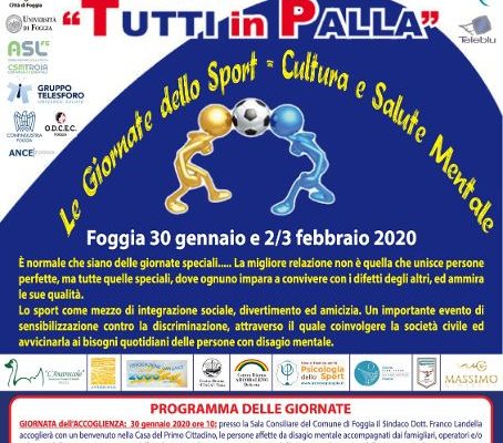 Con questi nobili intenti, l’Anpis Puglia, in collaborazione con l’Associazione Tutti in Palla Foggia, Il Comune di Foggia, il Foggia Calcio 1920 ed altri partner, persegue sempre le medesime finalità; e, cioè, attraverso lo strumento dello Sport, di sensibilizzare l’intera collettività sul tema della Salute Mentale e sulla promozione di processi di integrazione sociale di persone affette da disagio mentale, realizzando nella città di Foggia, l’evento: “Le Giornate dello Sport-Cultura e Salute Mentale – 5° edizione Tutti in Palla, con delle iniziative sociali, culturali e sportive nelle seguenti giornate: