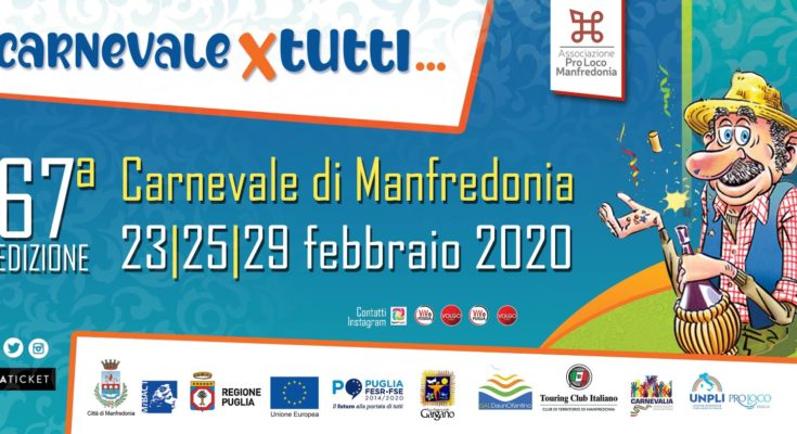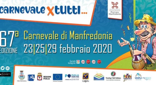 Ore 18.30 alle 21.00 – Corso Manfredi – “Carnival Folk”, spettacolo itinerante del gruppo folk “La Pacchianella” di Monte Sant’ Angelo, tra folklore e tradizione del Gargano, coordinati da Ciro Murgo responsabile del dipartimento arte e tradizioni della Pro Loco di Manfredonia.