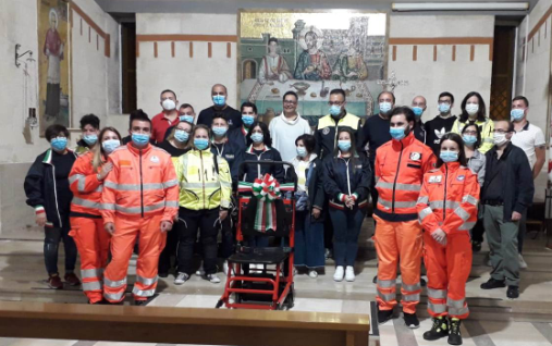 Nella foto allegata, la benedizione ad opera di Padre Luis di Siponto dell’ultima arrivata in casa Paser, una sedia portantina automatica per il trasporto di persone non deambulanti.