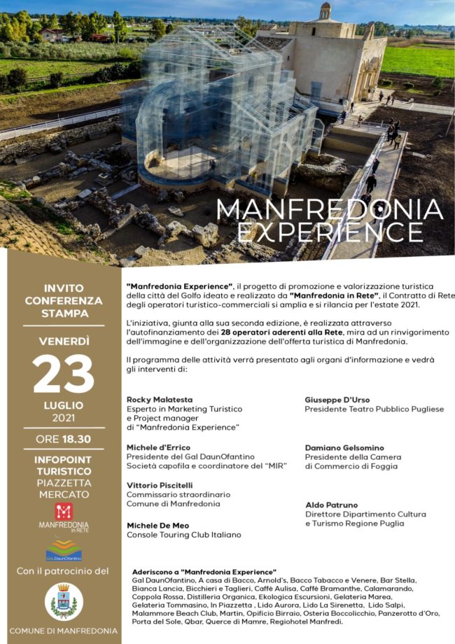 “Manfredonia Experience”, il progetto di promozione e valorizzazione turistica della città del Golfo ideato e realizzato da “Manfredonia in Rete”, il Contratto di Rete degli operatori turistico-commerciali si amplia e si rilancia per l’estate 2021.