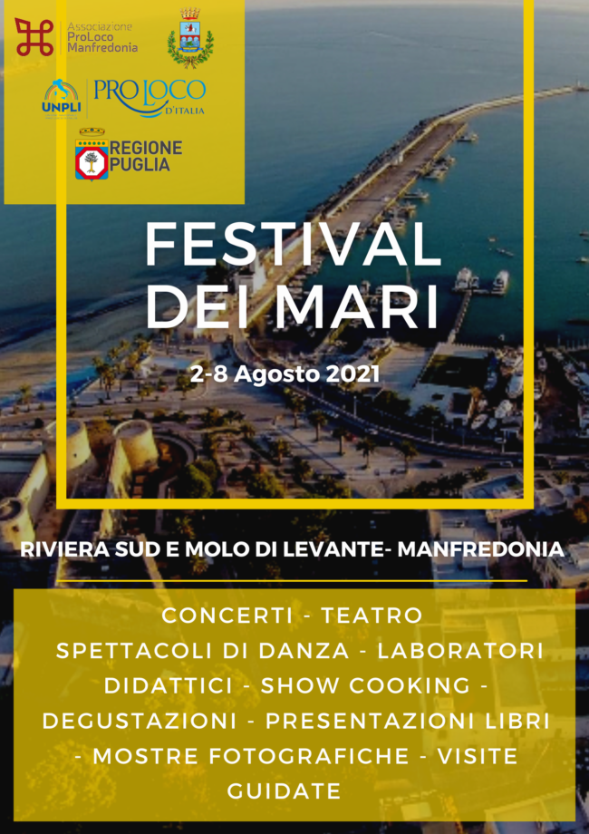 Inizia Lunedì 2 Agosto c.a. il Festival del Mare, manifestazione organizzata dall’associazione Pro Loco di Manfredonia. Un’iniziativa singolare nel panorama nazionale, capace di aggregare nello stesso luogo tutti i temi legati al mare, alla formazione, alle professioni e alla ricerca, una manifestazione che rappresenta un momento di riflessione, analisi e divulgazione scientifica dei temi legati al mare ed è caratterizzata da eventi interattivi e trasversali quali conferenze, laboratori, mostre, spettacoli e workshop, adatti a ogni genere di pubblico.