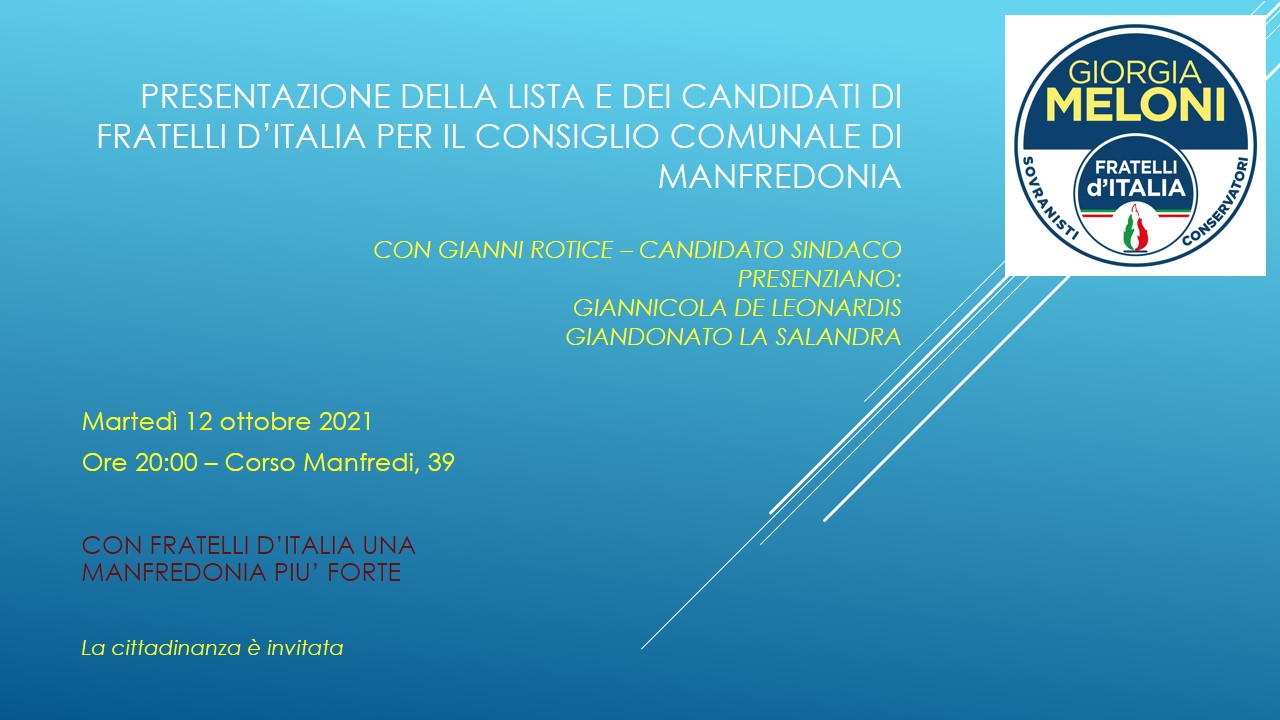 Questa sera (12 ottobre 2021) alle ore 20:00 presso lo spazio esterno del Comitato Elettorale di Fratelli d’Italia di Manfredonia, al Corso Manfredi, 39, avrà luogo la cerimonia di presentazione della lista e dei candidati al Consiglio Comunale per le elezioni del 7 novembre 2021.