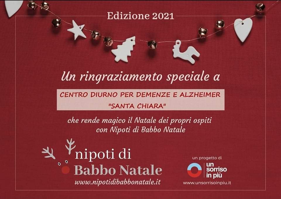 Il Gruppo Santa Chiara aderisce per il terzo anno di seguito al progetto” I NIPOTI DI BABBO NATALE”, grazie all’Associazione Onlus“Un Sorriso in più”.Un progetto semplice e pieno di vita, affinchè nessun anziano si senta solo a Natale!