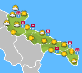 GIOVEDI’: Un mite anticiclone si rinforza sulla nostra Penisola portando un graduale miglioramento anche su Molise, Puglia e Basilicata con ampi rasserenamenti entro la serata. Da segnalare più nuvolosità tra la notte e il mattino tra Est Molise, Gargano, Daunia, Murge e nord Lucania ma senza il rischio di fenomeni degni di nota. Ventilazione ancora sostenuta settentrionale. Zero termico nell’intorno di 2600 metri. Mare mosso. Temperature stabili o in locale rialzo.