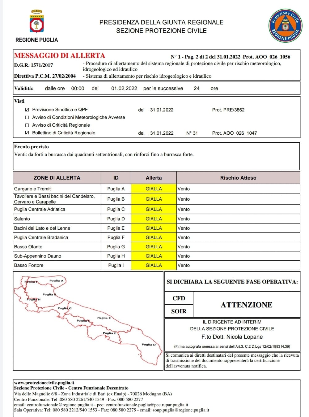 La Protezione Civile Regione Puglia ha diramato un messaggio di allerta GIALLA (causa venti da forti a burrasca dai quadranti settentrionali, con rinforzi fino a burrasca forte) dalle ore 00:00 del 01/2/2022 e per le successive 24 ore. Il Comune di Manfredonia invita la cittadinanza a prestare attenzione.