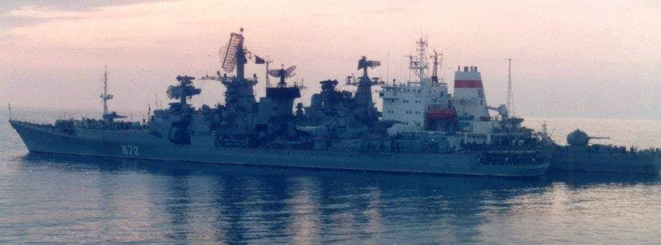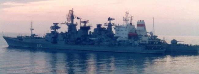Nelle foto: Golfo di Manfredonia, gennaio 1987. Si vedono in queste immagini scattate all’alba un incrociatore classe Kresta 2 ed un caccia classe sovremenny affiancati ad una nave cisterna (fonte: https://www.facebook.com/groups/504519503056637/permalink/796519177190000/)