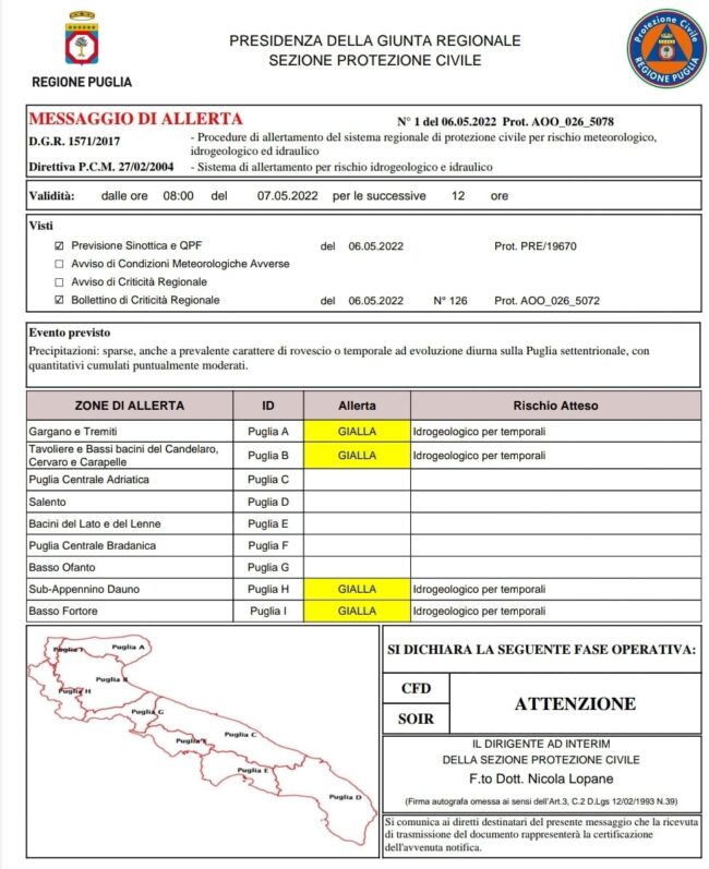 La Protezione Civile Regione Puglia ha diramato un messaggio di allerta GIALLA (per precipitazioni sparse, anche a prevalente carattere di rovescio o temporale ad evoluzione diurna sulla Puglia settentrionale, conquantitativi cumulati puntualmente moderati) dalle ore 08:00 del 07/5/2022 e per le successive 12 ore.9