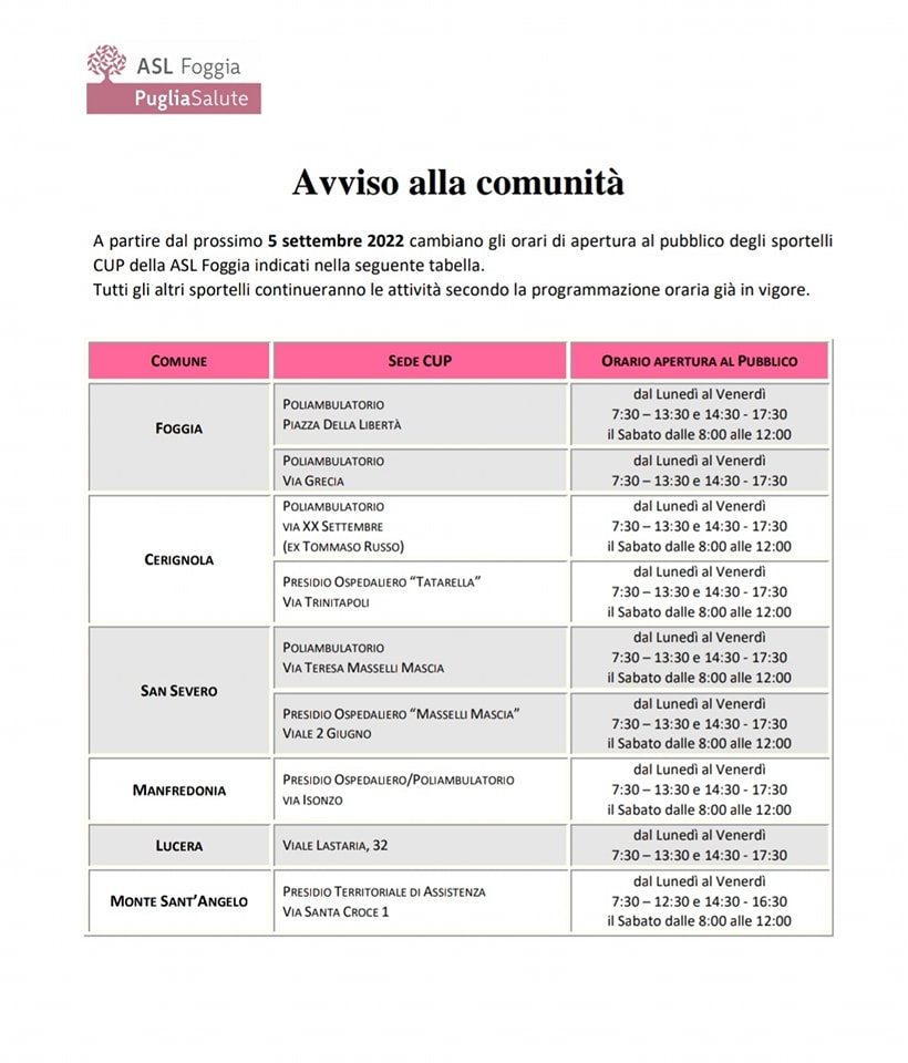 Dal 5 settembre 2022 cambiano gli orari di alcuni sportelli CUP della ASL Foggia. Guarda qui