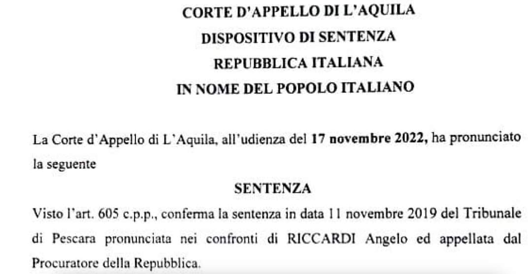 Ieri, dopo dieci anni di processi, la Corte d’Appello de L’ Aquila ha messo la parola fine ad una delle pagine più difficili della mia vita, confermando la sentenza di piena assoluzione di primo grado del Tribunale di Pescara dell’11 novembre 2019.