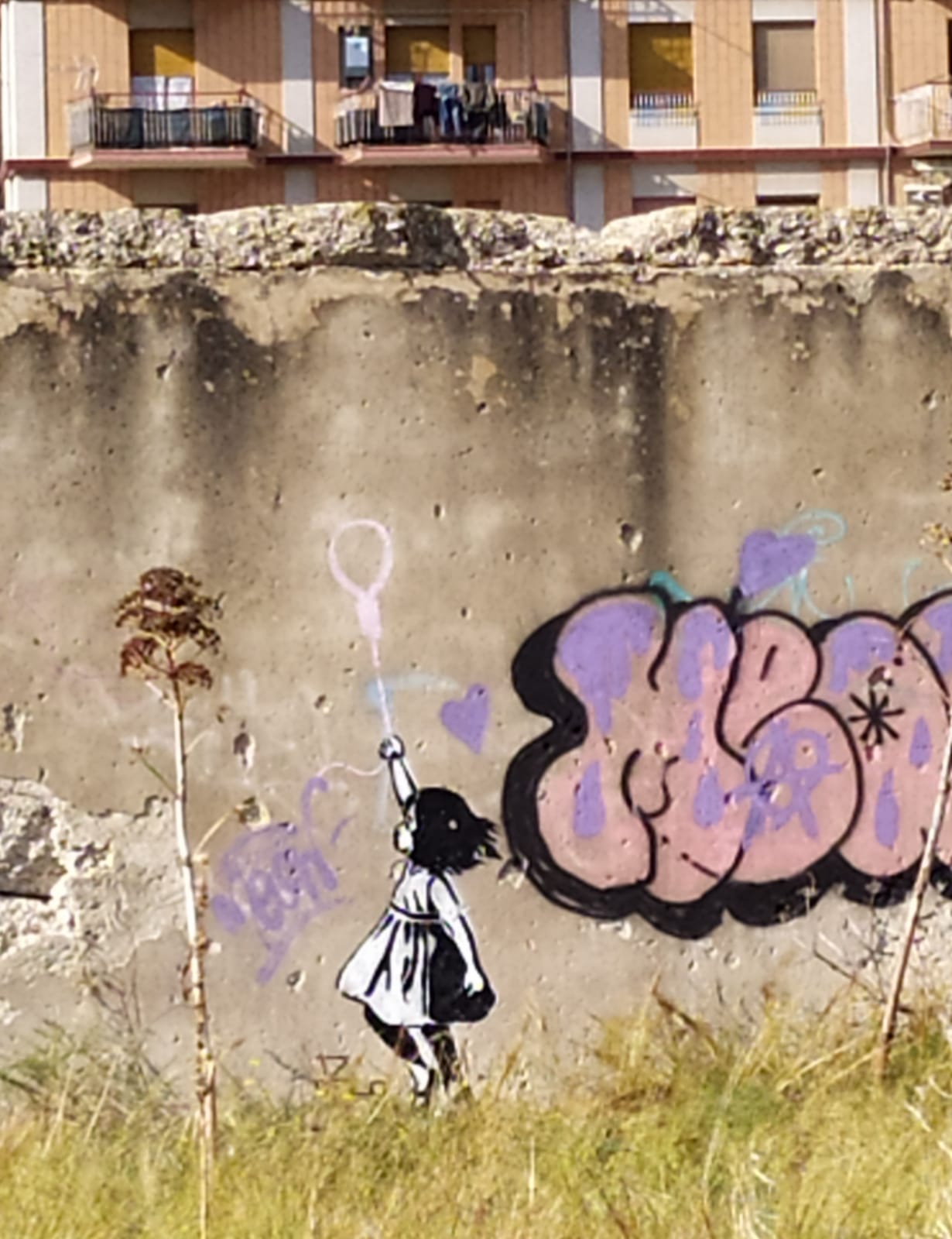 Ci sono passato tante volte, sulla strada che va dal centro di Riabilitazione Cesarano verso Siponto. All’altezza di quel famoso ponte mai completato è ancora in piedi un caseggiato abbandonato e sul muro di quella costruzione diroccata sono ben visibili vari graffiti ma, uno in particolare ha sempre destato la mia attenzione, lì impresso da almeno tre anni: una bimba che tiene sospeso un palloncino!? Macchè?! Non è un palloncino, quella bimba tiene fra le mani l’estremità di un cappio in sospensione.