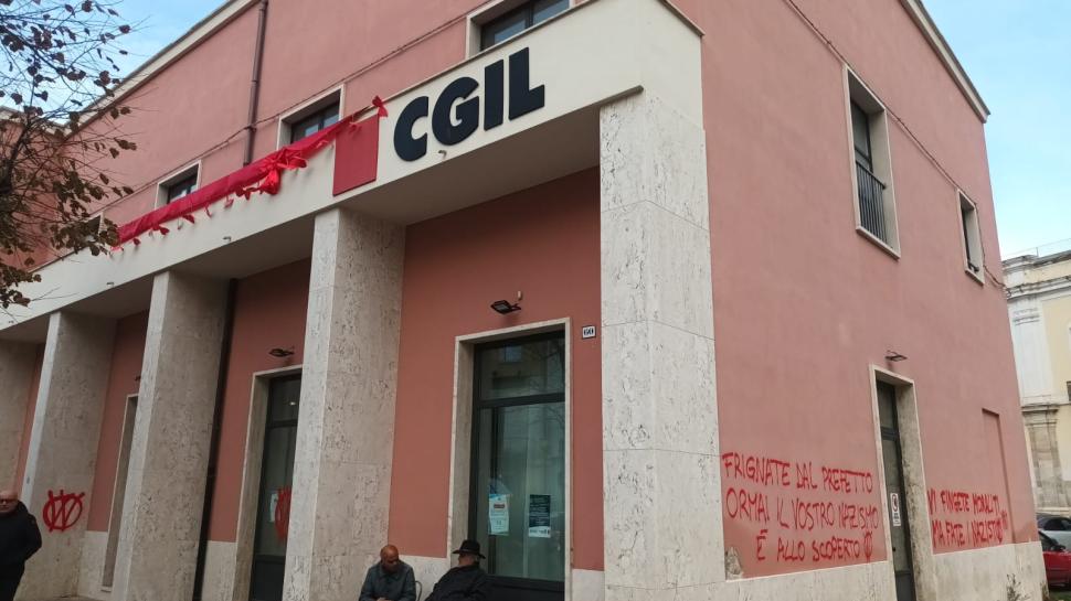 Attacco «No vax» sui muri della sede della Cgil in via della Repubblica, a Foggia. Nella notte qualcuno, favorito dal buio, ha imbrattato le pareti esterne del palazzo che ospita la sede del sindacato firmandosi col simbolo dei No vax. L’accusa che lanciano alla Cgil è di essere un «sindacato nazista». «Vi fingete morali ma fate i nazisti» si legge in una delle scritte, e che «Frignate dal prefetto ma ormai il vostro nazismo è allo scoperto».