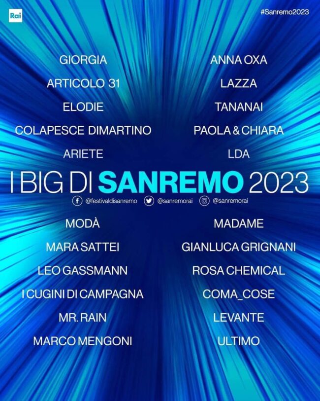 22 Big in gara e 6 finalisti di Area Sanremo per questa edizione che non prevede SUPEROSPITI ITALIANI, per rispetto verso i grandi nomi che hanno scelto di mettersi in gioco.