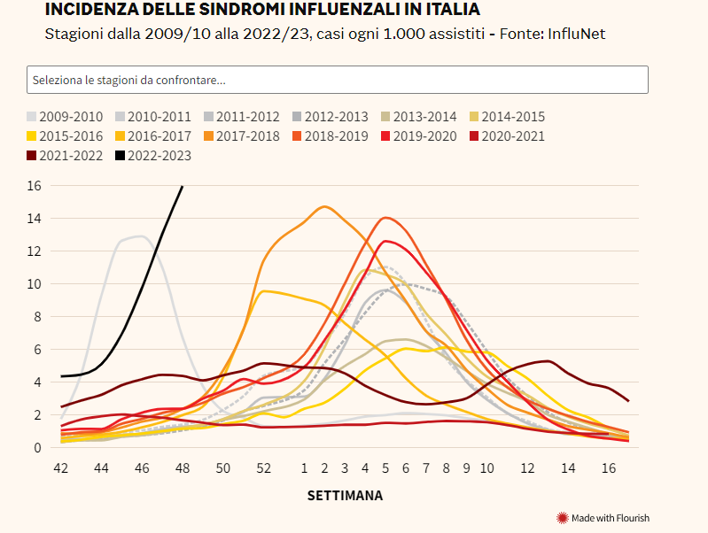Il grafico sopra mostra l’incidenza delle sindromi influenzali dal 2009-10 a oggi. È evidente come la stagione 2022-23, attualmente in corso, da questa settimana abbia superato l’incidenza di tutte le precedenti prese in esame. Risulta ancora più marcata la differenza con gli ultimi due anni di pandemia.