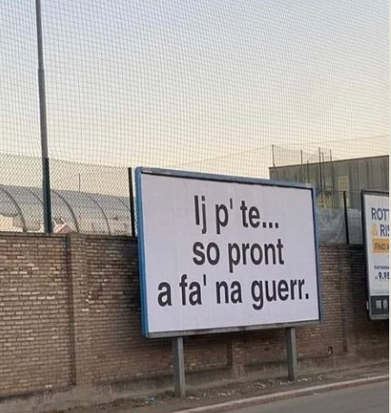 Alla vigilia di San Valentino, in via Zannotti, è comparso un poster 6×3 che non passa inosservato. ‘Ij p’ te… so pront a fa’ na guerr’ (Io per te sono pronto a fare una guerra) si legge sull’impianto pubblicitario all’ingresso della città dall’autostrada, sulla Statale 272, all’altezza del campo sportivo ‘Ricciardelli’. La semplice scritta su fondo bianco non reca alcuna firma o segno distintivo.