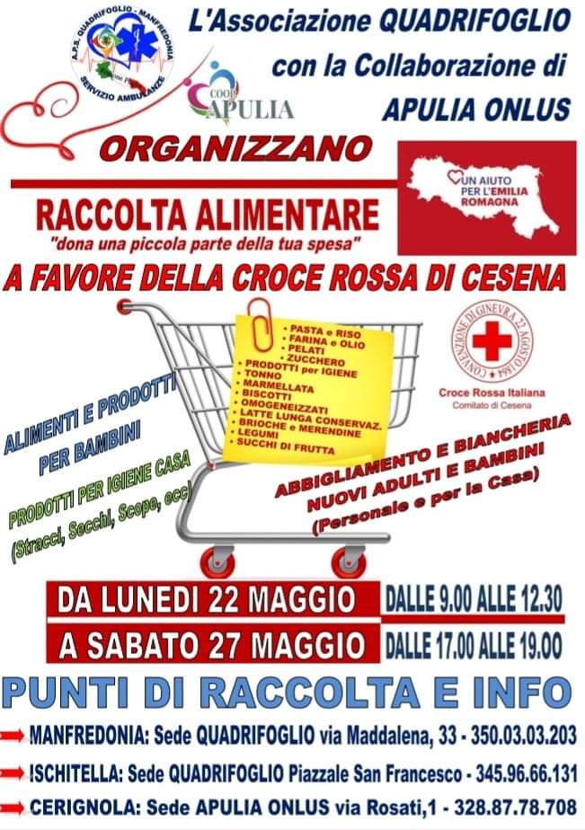 Il presidente dell’Associazione Quadrifoglio di Manfredonia, Antonio Valente, ha risposto all’appello della Croce Rossa di Cesena ed ha organizzato una raccolta di beni di prima necessità, in collaborazione con la sede di Ischitella e con l’Apulia ONLUS di Cerignola, da destinare alle persone che hanno perso tutto a causa dell’alluvione catastrofica degli scorsi giorni in Emilia Romagna.
