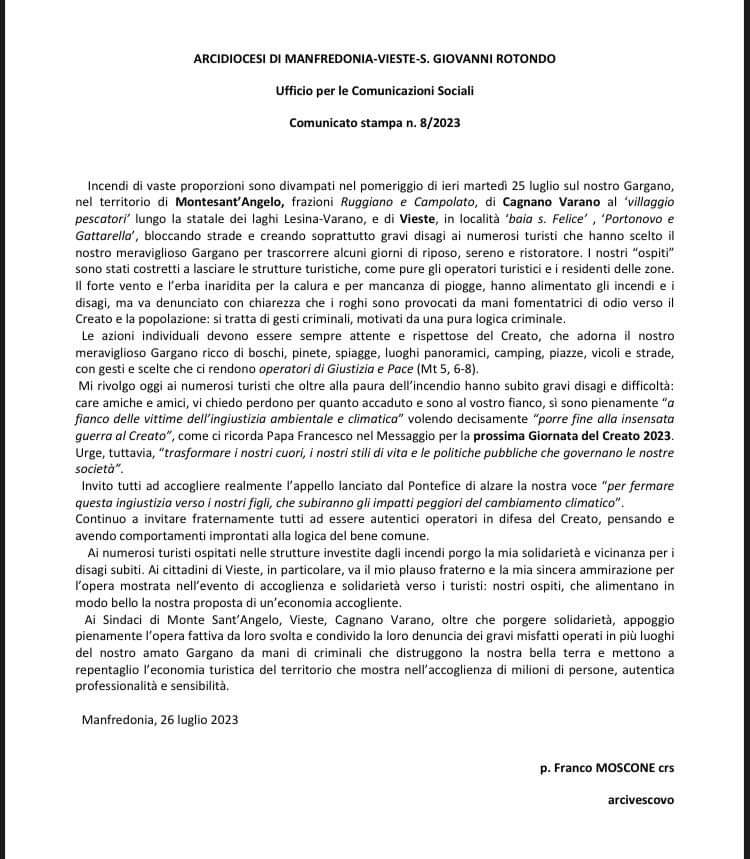Comunicato stampa n. 8/2023 dell’Arcivescovo padre Franco Moscone 📍 Manfredonia, 26 luglio 2023. Incendi di vaste proporzioni sono divampat