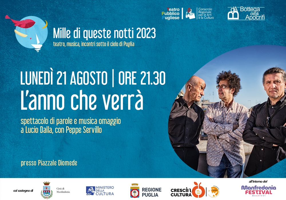 “Mille di queste notti” omaggia Lucio Dalla con “L’anno che verrà”. Spettacolo di parole e musica con Peppe Servillo, Javier Girotto e Natalino Mangialavite. Lunedì 21 agosto 2023 h 21.30, Piazzale Diomede, Manfredonia.