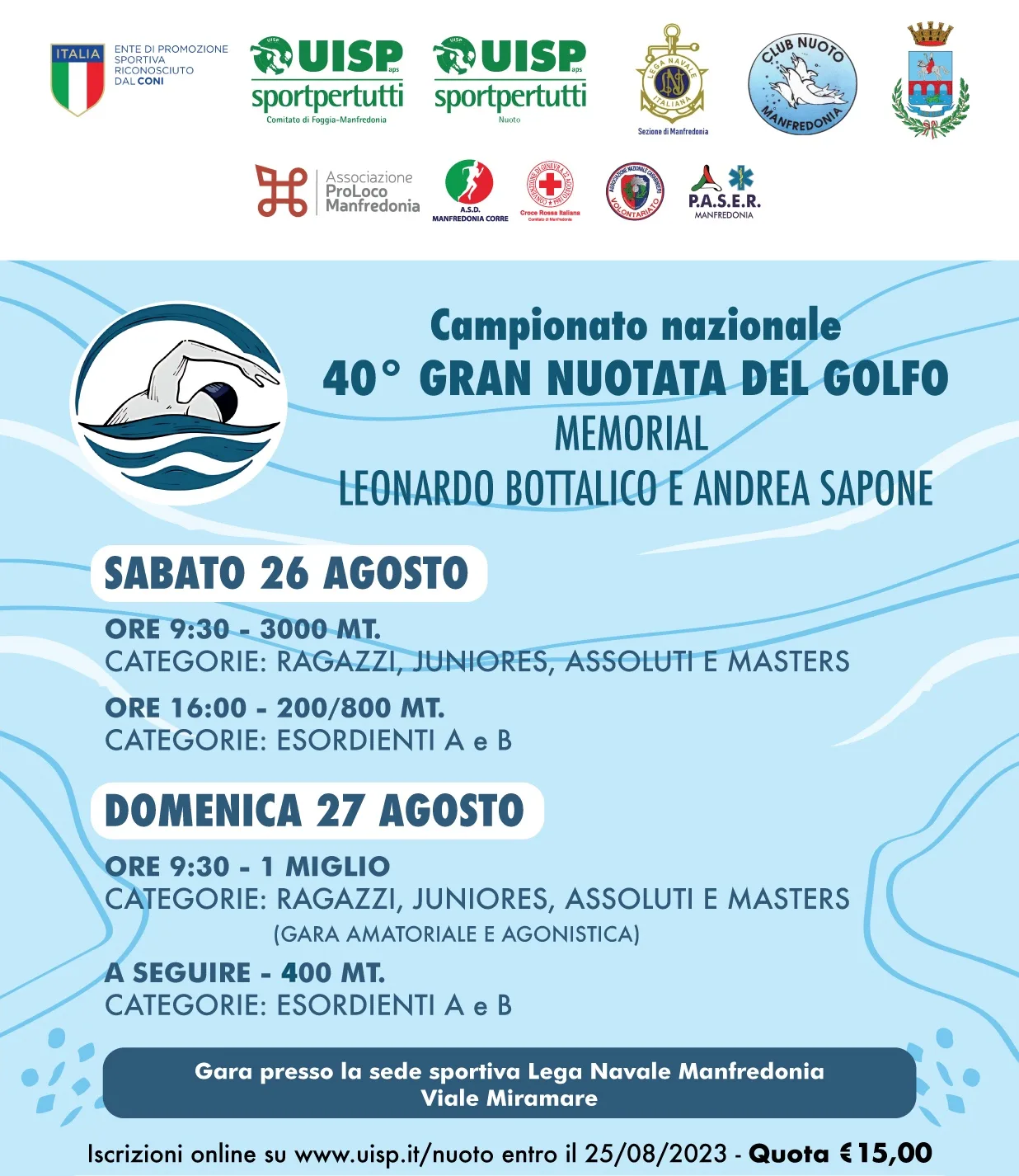 Si terrà a Manfredonia, nei giorni di sabato 26 e domenica 27 agosto, il Campionato Nazionale Acque Libere UISP, 40esima edizione della Gran Nuotata del Golfo – Memorial Leonardo Bottalico e Andrea Sapone.
