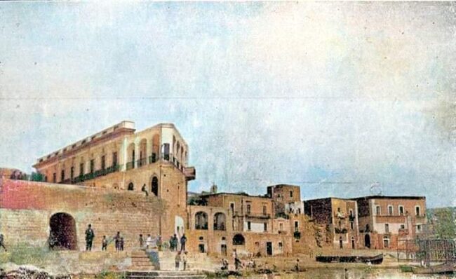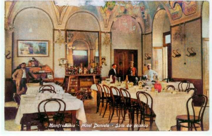 Il Grand Hotel Daniele era stato inaugurato nel 1910 sul lato sinistro della piazzetta panoramica, con affaccio sul Mandracchio (spiaggia Diomede). Per anni era stato l’unico albergo di Manfredonia ed era dotato di una lussuosa ed ampia sala da pranzo che si sviluppava verso il mare con una veranda, chiusa lateralmente con vetrate. Era stato voluto, costruito e poi gestito da Daniele De Angelis, originario di Benevento e residente a Manfredonia. Fino alla fine degli anni ’20, scrive l’appassionato di storia sipontina Franco Rinaldi in un pezzo dedicato alla struttura, durante l’estate attraverso una scala interna dell’albergo i clienti si recavano direttamente alle cabine dello stabilimento balneare De Marzo, che all’epoca era allestito nel porto con sistema a palafitte sul mare, proprio sotto la rinomata struttura alberghiera.
