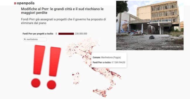 A Manfredonia sono ben tre i progetti finanziati dal PNRR in pericolo, per un totale di 7.069.944 euro. Parliamo dei lavori al complesso edilizio ex Istituto Nautico in via Dante Alighieri, dei lavori per la ripavimentazione di Corso Roma e delle opere di efficientamento energetico e messa in sicurezza dell’edificio scolastico “Infanzia Fieramosca”.