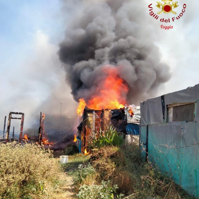 Un incendio di vaste dimensioni è divampato intorno alle 11 di oggi, sulla cosiddetta ‘pista’ di Borgo Mezzanone, ovvero l’insediamento abusivo che ospita circa 1500 braccianti di origine africana.L’incendio è attualmente in atto. Sul posto stanno operando i vigili del fuoco, giunti sul posto con varie squadre: oltre agli uomini del Presidio 115 presente nella borgata, infatti, sono intervenute le squadre del Distaccamento di Lucera e del Comando provinciale di Foggia, con l’ausilio di una autobotte. Diverse le baracche interessate dal rogo, al momento – secondo quanto riferito dagli operatori – non dovrebbero esserci persone ferite o intossicate. Seguono aggiornamenti