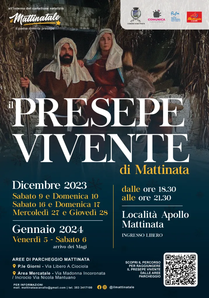 Il Presepe Vivente è un evento di grande rilevanza per la comunità di Mattinata, poiché rappresenta la storia della nascita di Gesù e i valori fondamentali del Natale. Attraverso la ricostruzione di scene e personaggi tradizionali, l’associazione accompagnerà i visitatori in un’atmosfera antica e magica. Anche per quest’anno la location è collocata in un antico casolare situato nella suggestiva piana di Mattinata, in contrada Apollo. (nei pressi delle ex-Scuole Medie)