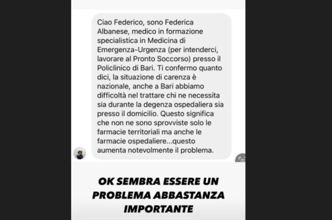 Sono introvabili gli enzimi pancreatici, secondo l’allarme lanciato da Fedez, operato al pancreas per un tumore a marzo del 2022. In queste ore – come da lui pubblicato nelle Instagram Stories sul suo profilo – gli stanno arrivando tantissime segnalazioni da tutta Italia, Puglia compresa.Il farmaco, che surroga le funzioni di un organo asportato o ridotto, è necessario ai pazienti per assimilare il cibo, ma se ne registrano importanti carenze dall’autunno del 2023. Carenze che potrebbero protrarsi fino a tutto il 2025, evidenzia una nota informativa dell’Agenzia Italiana del Farmaco, rivolta agli operatori sanitari.