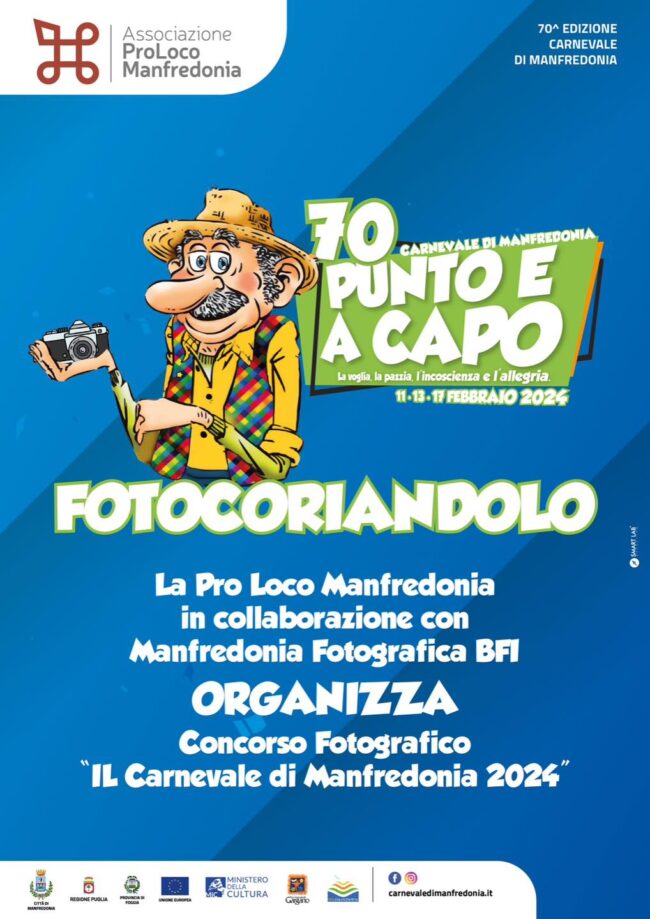 Concorso Fotografico “IL Carnevale di Manfredonia 2024” 1. Il tema del concorso è: A. CARNEVALE DI MANFREDONIA 2024 2. Il Concorso è aper