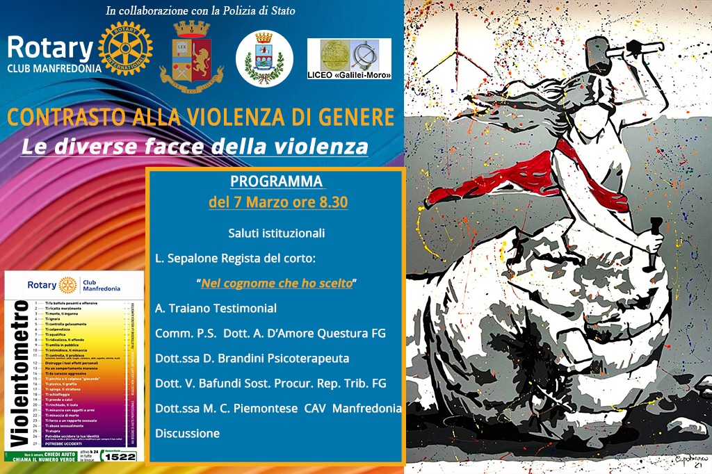 L’aula magna dei licei “Galilei-Moro” di Manfredonia, giovedì, sarà teatro di un importante convegno intitolato “Le diverse facce della violenza”, finalizzato, come recita la locandina, al contrasto alla violenza di genere. L’evento, che ha ricevuto il patrocinio della Polizia di Stato, è stato organizzato dal Rotary Club di Manfredonia e vedrà la proiezione del cortometraggio documentario“Nel cognome che ho scelto” realizzato dal regista foggiano Lorenzo Sepalone, con grandi consensi di critica nazionale, nel quale viene raccontata la storia del venticinquenne foggiano Alfredo, figlia di giovanna Traiano, vittima di femminicidio nel 2003 e nipote di Francesco, morto nel 2020, dopo essere stato ferito durante una rapina avvenuta all’interno del proprio bar. Al termine della proiezione vi sarà un dibattito pubblico, su tutte le forme di violenza con gli interventi del commissario presso la Questura di Foggia, dott. D’Amore, della psicoterapeuta, dott.ssa Brandini, del sostituto procuratore della Repubblica del Tribunale di Foggia, dott. Bafundi ed della dott.ssa Piemontese del Centro antiviolenza di Manfredonia.