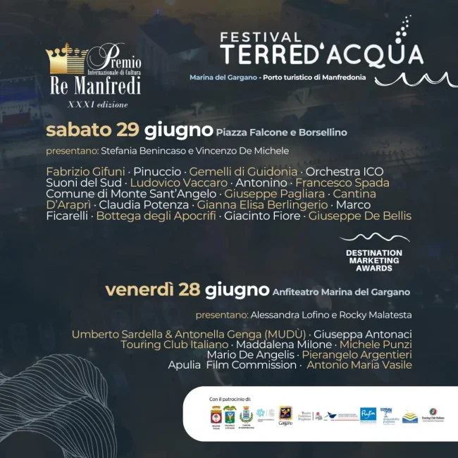 l Premio Internazionale di Cultura Re Manfredi alla sua XXXI edizione, invece, è la serata di Gala che chiuderà in grande stile il Festival! Questa è storicamente l’occasione di premiare la carriera di personalità illustri del territorio o di origini pugliesi.