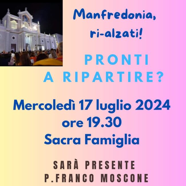 MANFREDONIA, RI-ALZATI! Riprendiamo questo slogan per invitare tutti a partecipare attivamente alla vita della città, per sostenere e vigilare l’amministrazione della cosa pubblica e indicare profeticamente scelte evangeliche… Chi desidera partecipare, l’ appuntamento è oggi mercoledì 17 luglio 2024 alle ore 19.30 presso la Sacra Famiglia.