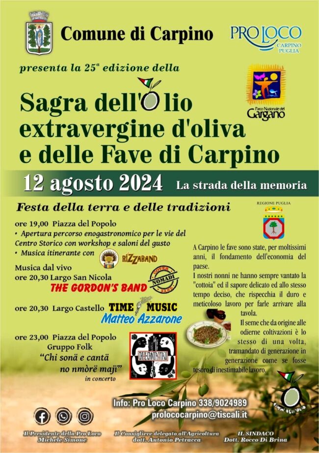 Come ogni estate, Carpino celebra le sue eccellenze. Lunedì 12 agosto è in programma la Sagra dell’Olio extravergine d’oliva e delle fave di Carpino. Una grande manifestazione in programma nel centro storico, con degustazione di prodotti tipici, musiche e danze.