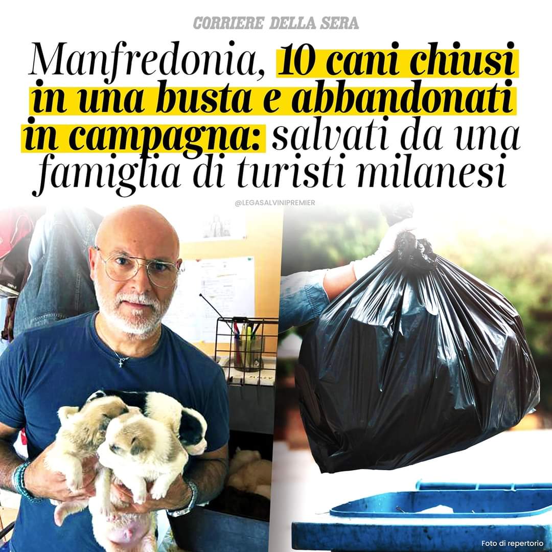 “A Manfredonia, una famiglia di turisti milanesi ha salvato dieci cuccioli di cane abbandonati in una busta in campagna, dopo aver sentito i loro