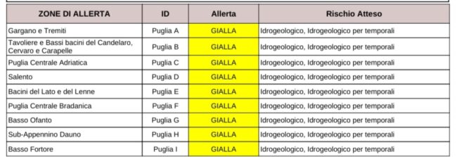Il dipartimento della protezione civile ha emesso per la Puglia l’allerta con validità dalle 20 di oggi per ventiquattro ore. Si prevedono “precipitazioni da sparse a diffuse, anche a carattere di rovescio o temporale, con quantitativi puntualmente moderati.” Rischio: secondo lo schema, fonte protezione civile della Puglia.