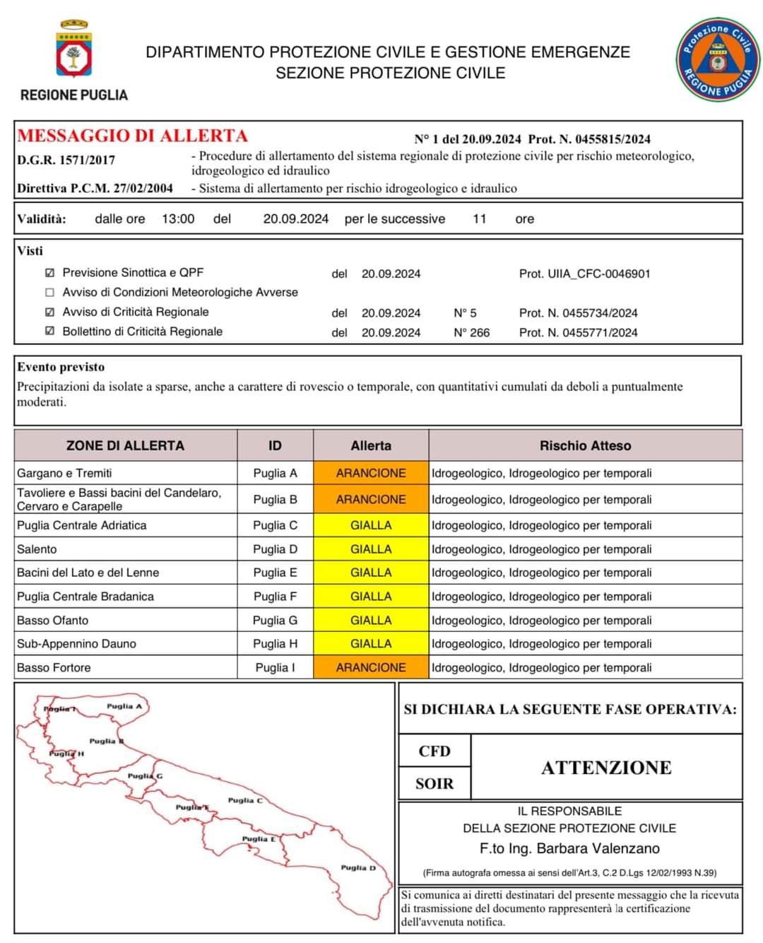 Dalle 13:00 del 20 settembre e per le successive 11h è stata diramata, dalla Protezione Civile della Regione Puglia, un’allerta meteo p