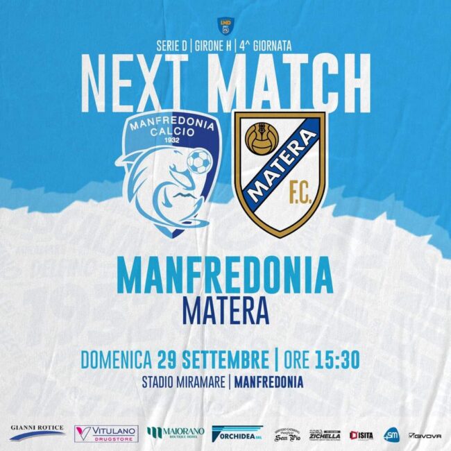4ª Giornata | Serie D – Gir. H Domenica 29 Settembre ore 15:30 ️ Matera Stadio Miramare | Manfredonia (FG) ️ : ’ – /