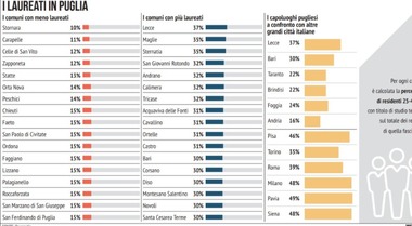 I laureati vivono in città. Chi resta nei piccoli paesi più spesso non conclude il percorso universitario, o se lo conclude poi magari va a vivere in città. Il quadro, per tanti aspetti desolante, viene fuori dal report di Openpolis sui numeri dei laureati in rapporto ai residenti nei Comuni italiani. Ed emergono forti divari territoriali; non solo quelli storicizzati tra Nord e Sud, che pure continuano a rappresentare un problema per il Mezzogiorno, ma anche all’interno delle stesse aree. La differenza tra una città capoluogo – salvo qualche eccezione – della Puglia e un paesino è ancor più pesante rispetto a quella che sussiste tra Lecce e Roma, per esempio. Basta tratteggiare una cartina della Puglia, o di qualunque altra regione italiana, per capire quanto la concentrazione di chi ha un titolo di studio terziario (o superiore) sia più forte nelle città. E qualche volta anche nei centri urbani più vicini alle città.