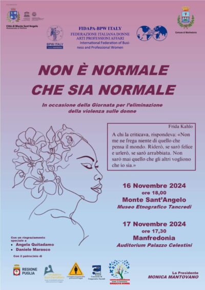 L esserci ed essere una squadra, ci rende forti e meno sole! Un bel lavoro di squadra, Fidapa Manfredonia Distretto Sud-Est! Vi aspettiamo nelle giornate 16Novembre al Comune di Monte Sant’Angelo ed il 17Novembre aComune di Manfredonia! Grazie alle assessore al welfare Lea Basta e Maria Teresa Valente! Una bella platea di ospiti e di relatori, che vi sveleremo nei giorni successivi!
