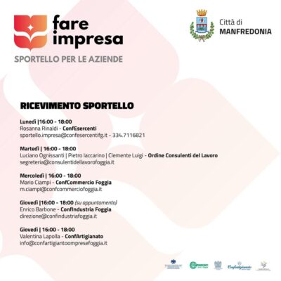 Il Comune di Manfredonia, in collaborazione con le associazioni di categoria ConfCommercio Foggia, ConfEsercenti Foggia, ConfIndustria Foggia, ConfArtigianto Foggia e l’Ordine dei Consulenti del Lavoro di Foggia, ha attivato lo Sportello gratuito “Fare Impresa”. Questo servizio è pensato per supportare cittadini, aspiranti imprenditori e aziende nel percorso imprenditoriale.