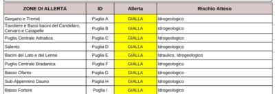 Il dipartimento della protezione civile ha emesso per la Puglia l’allerta con validità dalle 8 di domani, 18 gennaio, per sedici ore. Si prevedono